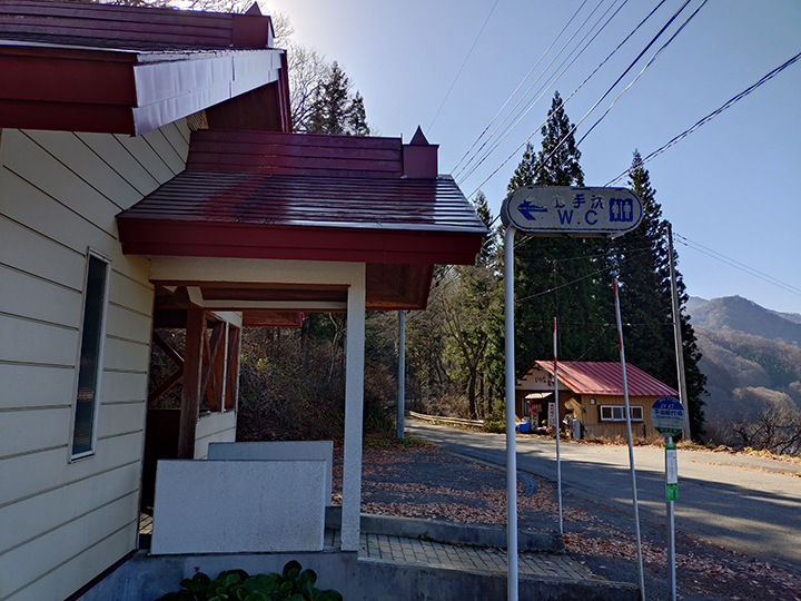 入口の張り紙を見たら少し離れた集落に公衆トイレがあるとの案内。