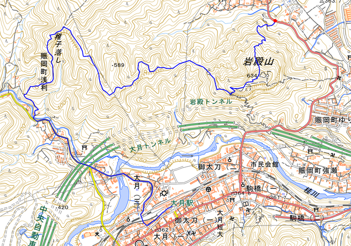 お後は普通に歩いて大月駅まで戻ってきましたが、大月の街は川筋から一段高い所にあるんですね。