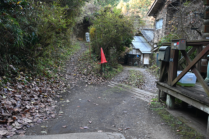 で、舗装道路の際奥に住宅がありますが、そのすぐ脇から始まるのが登山道。