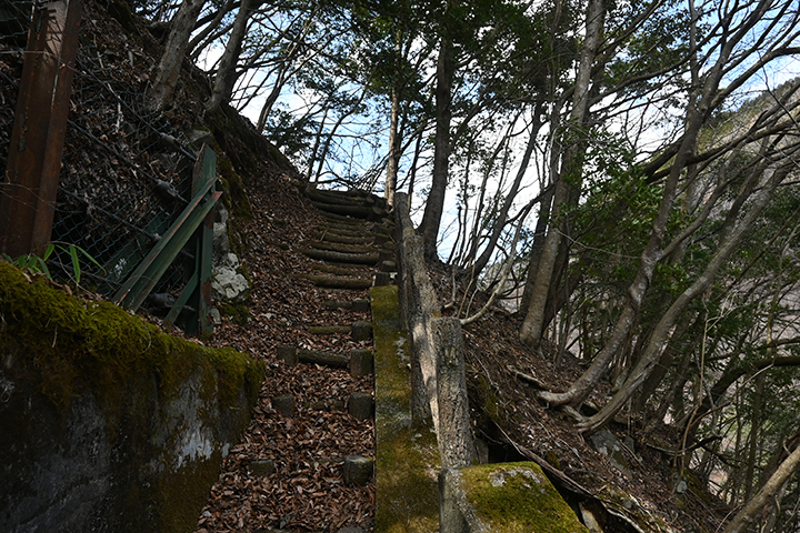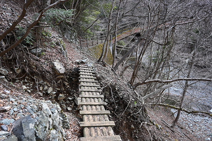 斜面が崩れたから応急的な橋みたいですけど、歩き慣れてないと高さが怖いかも。